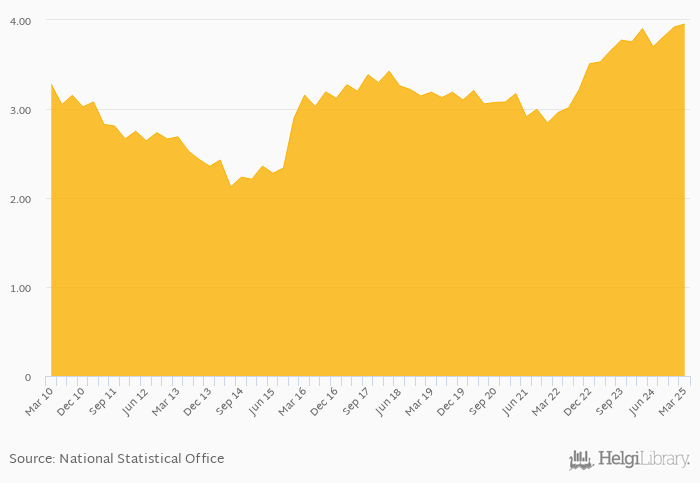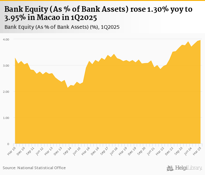 Bank equity as a share of bank assets rose 1.30% yoy to 3.95% in Macao in 1Q2025, according to the National Central Bank. This is 0.878% more than in the previous quarter.