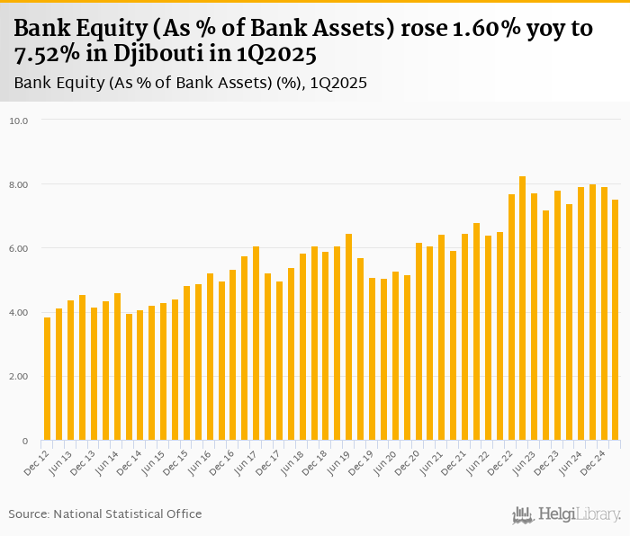 Bank equity as a share of bank assets rose 1.60% yoy to 7.52% in Djibouti in 1Q2025, according to the National Central Bank. This is 5.08% less than in the previous quarter.