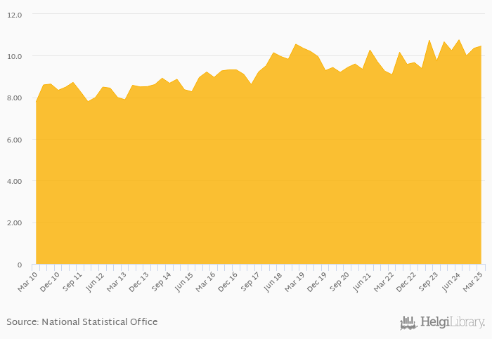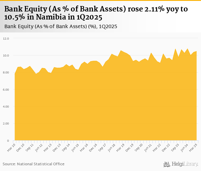 Bank equity as a share of bank assets rose 2.11% yoy to 10.5% in Namibia in 1Q2025, according to the National Central Bank. This is 1.05% more than in the previous quarter.