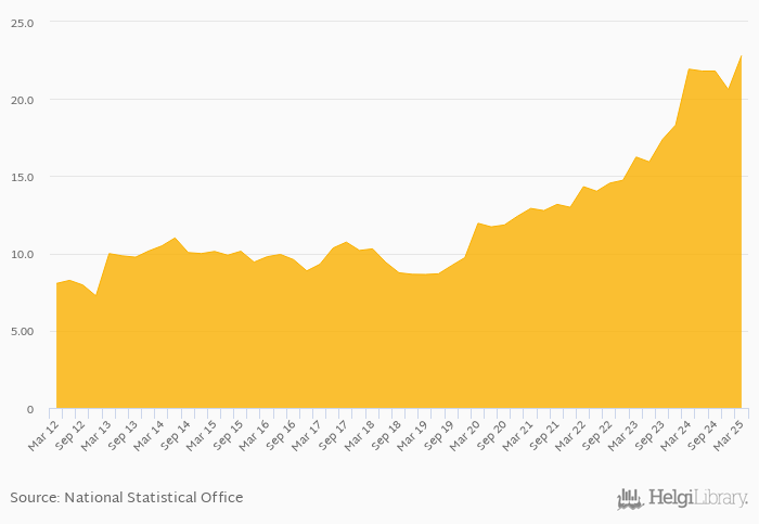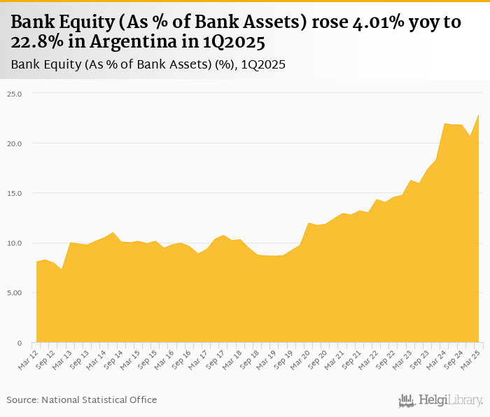 Bank equity as a share of bank assets rose 4.01% yoy to 22.8% in Argentina in 1Q2025, according to the National Central Bank. This is 10.7% more than in the previous quarter.