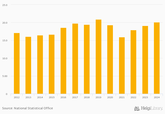 Historically, bank equity as a share of bank assets in Maldives reached an all time high of 20.9% in 2019 and an all time low of 15.9% in 2021.