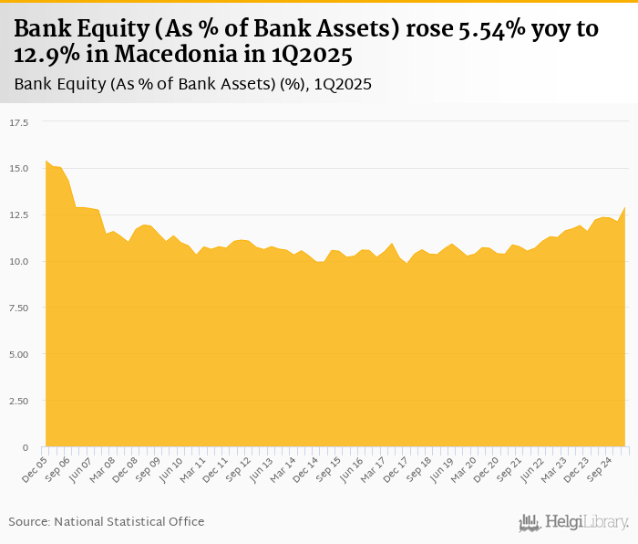 Bank equity as a share of bank assets rose 5.54% yoy to 12.9% in Macedonia in 1Q2025, according to the National Central Bank. This is 6.40% more than in the previous quarter.