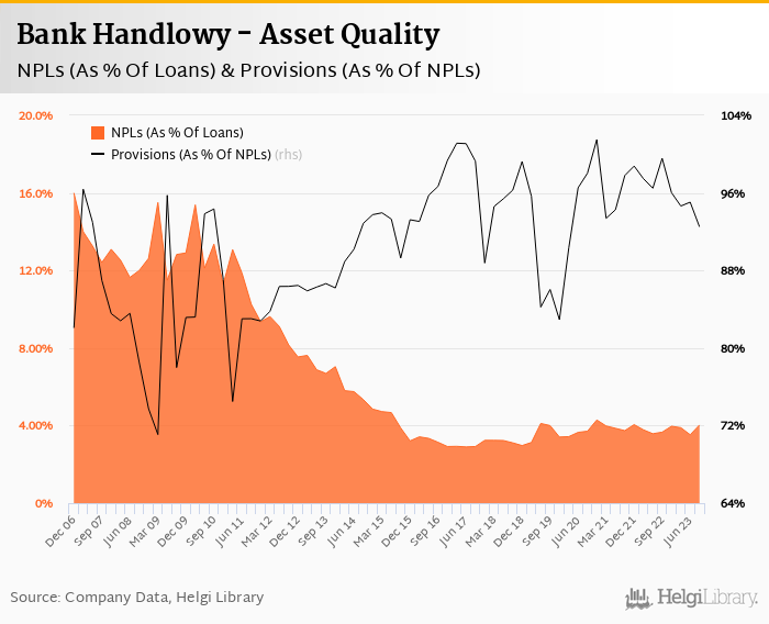 Bank Handlowy's non-performing loans reached 4.03% of total loans at the end of 2023-09-30, up from 3.66% compared to the previous year. Historically, the NPL ratio hit an all time high of 16.0% in 2006-12-31 and an all time low of 2.90% in 2017-06-30.