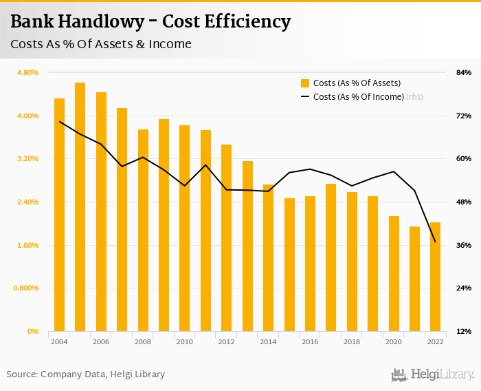 Bank Handlowy's cost to income ratio reached 36.7% in 2022, down from 51.1% compared to the previous year.