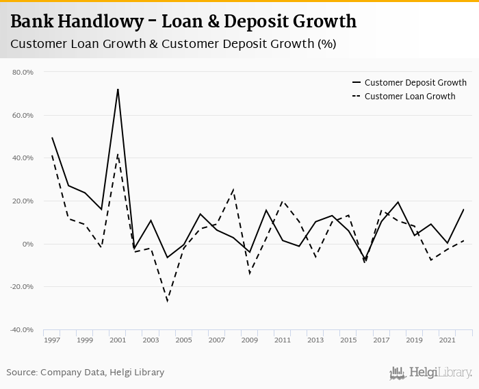 Bank Handlowy's customer loan growth reached 1.37% in 2022, up from -2.68% compared to the previous year. Historically, the bank’s loans growth reached an all time high of 41.8% in 2001 and an all time low of -26.5% in 2004. In the last decade, the average annual loan growth amounted to 2.91%.