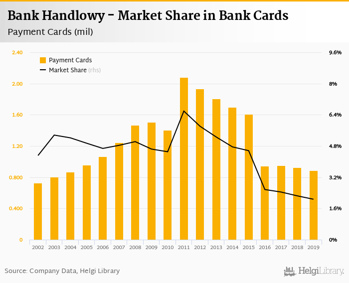 Bank Handlowy therefore accounted for 2.07% of all bank cards issued by banks in Poland at the end of 2019. Historically, the bank’s market share in payment cards reached an all time high of 6.59% in 2011 and an all time low of 2.07% in 2019.