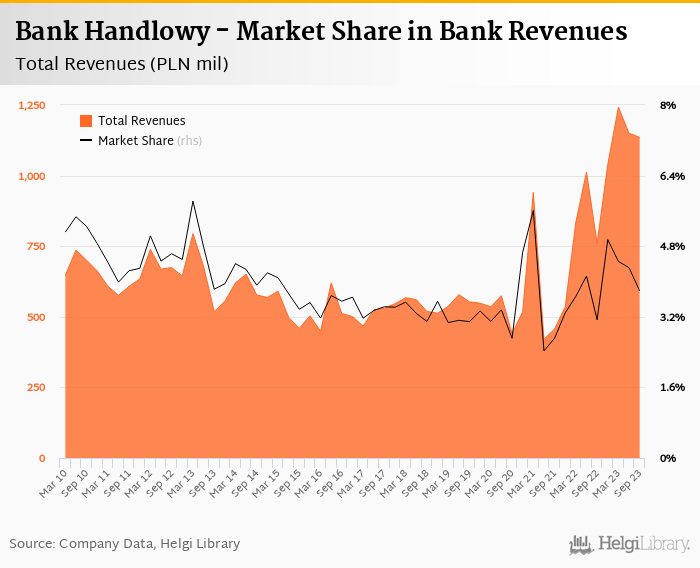 As a result, Bank Handlowy accounted for 3.79% of all bank revenues generated by banks in Poland in 2023-09-30. Historically, the bank’s market share in total revenues reached an all time high of 5.82% in 2013-03-31 and an all time low of 2.43% in 2021-06-30.
