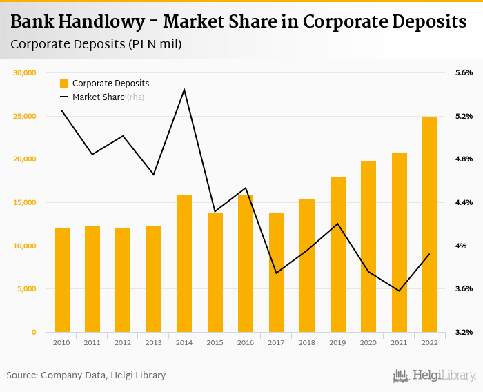 Bank Handlowy accounted for 3.92% of all corporate deposits taken by banks in Poland at the end of 2022. Historically, the bank’s market share in corporate deposits reached an all time high of 5.44% in 2014 and an all time low of 3.58% in 2021.
