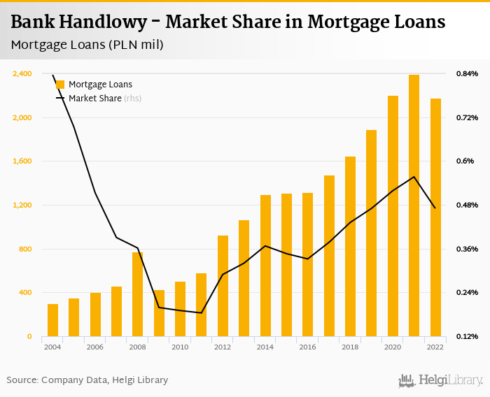 Bank Handlowy accounted for 0.470% of all mortgage loans issued in Poland at the end of 2022. Historically, the bank’s market share in mortgage loans reached an all time high of 0.836% in 2004 and an all time low of 0.184% in 2011.