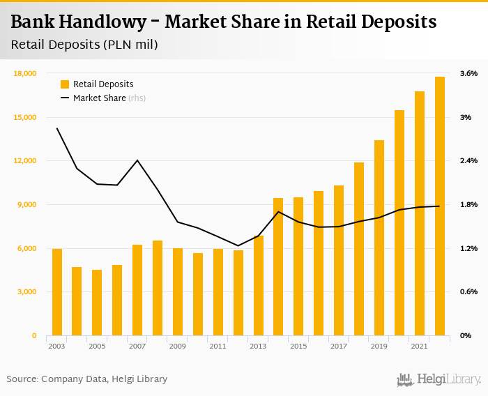 Bank Handlowy accounted for 1.77% of all retail deposits taken by banks in Poland at the end of 2022. Historically, the bank’s market share in retail deposits reached an all time high of 2.85% in 2003 and an all time low of 1.23% in 2012.