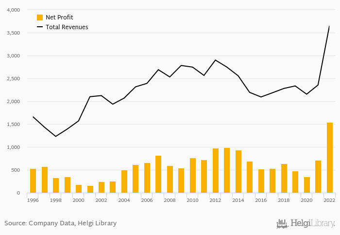 On the other hand, bank’s revenues amounted to an all time high of PLN 3,648 mil in 2022 and an all time low of PLN 1,230 mil in 1998. The average revenues in the last five years reached PLN 2,554 mil.