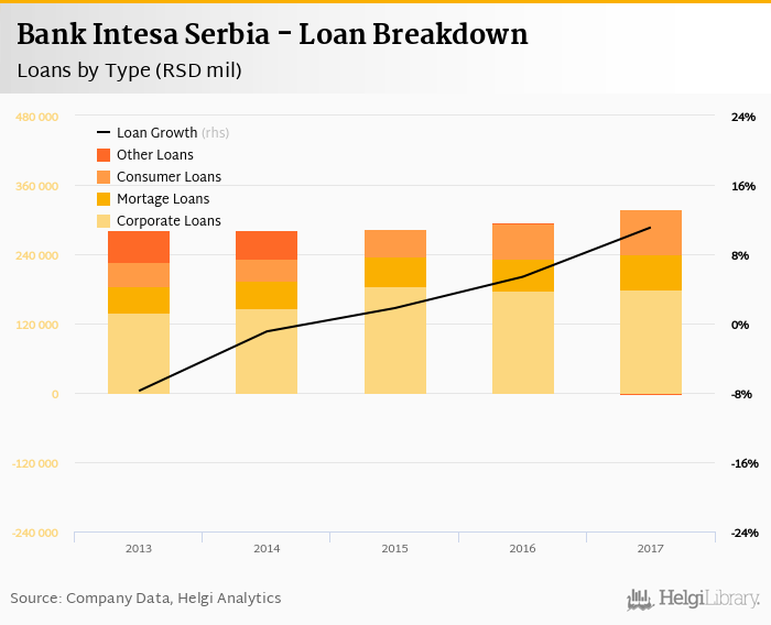 Mortgage loans represented 18.9% of the bank's loan book at the end of the year 2017, consumer further 24.9% and corporate loans 56.7% of total loans.
