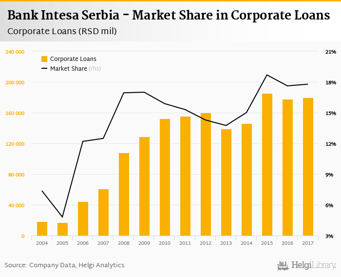 Bank Intesa Serbia accounted for 17.8% of all corporate loans issued in Serbia at the end of 2017. Historically, the bank’s market share in corporate loans reached an all time high of 18.7% in 2015 and an all time low of 4.82% in 2005.