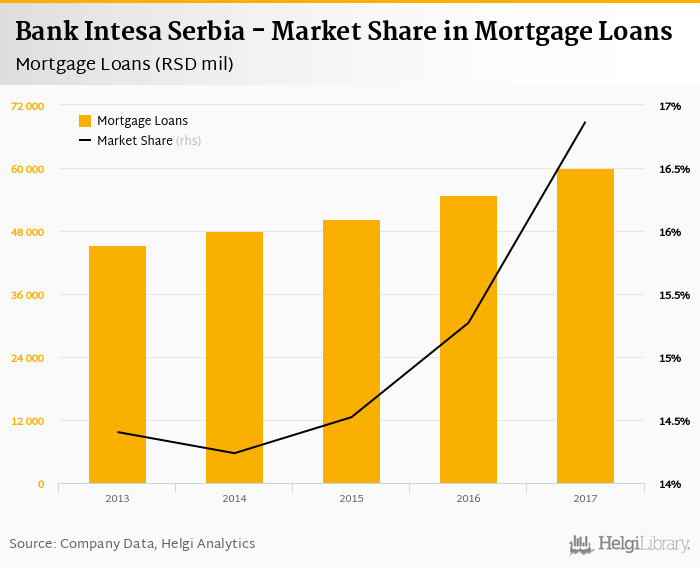 Bank Intesa Serbia accounted for 16.9% of all mortgage loans issued in Serbia at the end of 2017. Historically, the bank’s market share in mortgage loans reached an all time high of 16.9% in 2017 and an all time low of 14.2% in 2014.
