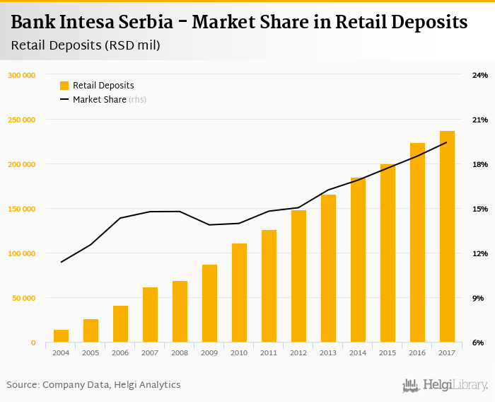 Bank Intesa Serbia accounted for 19.4% of all retail deposits taken by banks in Serbia at the end of 2017. Historically, the bank’s market share in retail deposits reached an all time high of 19.4% in 2017 and an all time low of 11.3% in 2004.