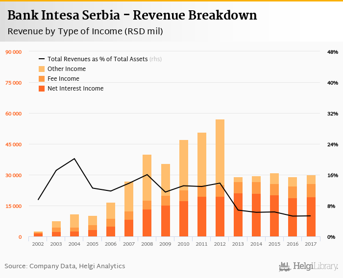 Comparing Bank Intesa Serbia with its closest peers, Komercijalna Banka Beograd generated total revenues of 5.43% of assets in 2017, Societe Generale Serbia operated with 4.73% revenue margin and Raiffeisenbank Serbia produced total income worth 5.87% of assets.