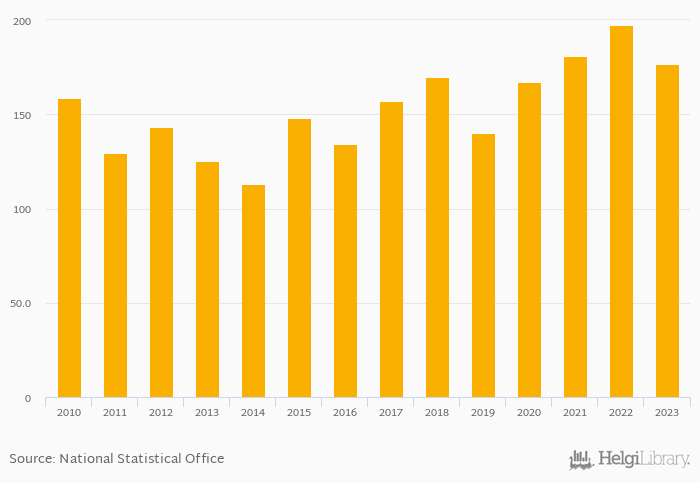 Historically, bank liquid assets as a share of short-term liabilities in Gabon reached an all time high of 198% in 2022 and an all time low of 113% in 2014.