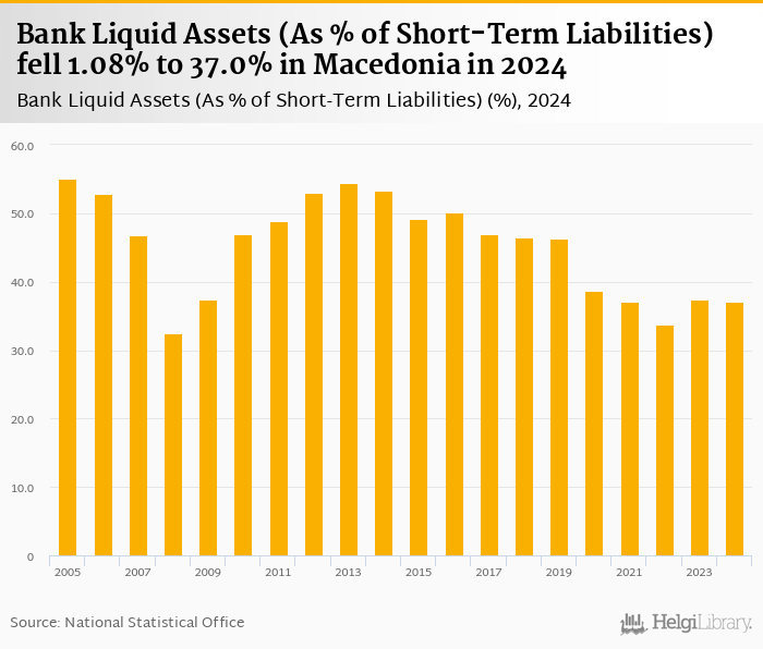 Bank liquid assets as a share of short-term liabilities fell 1.08% to 37.0% in Macedonia in 2024, according to the National Central Bank.