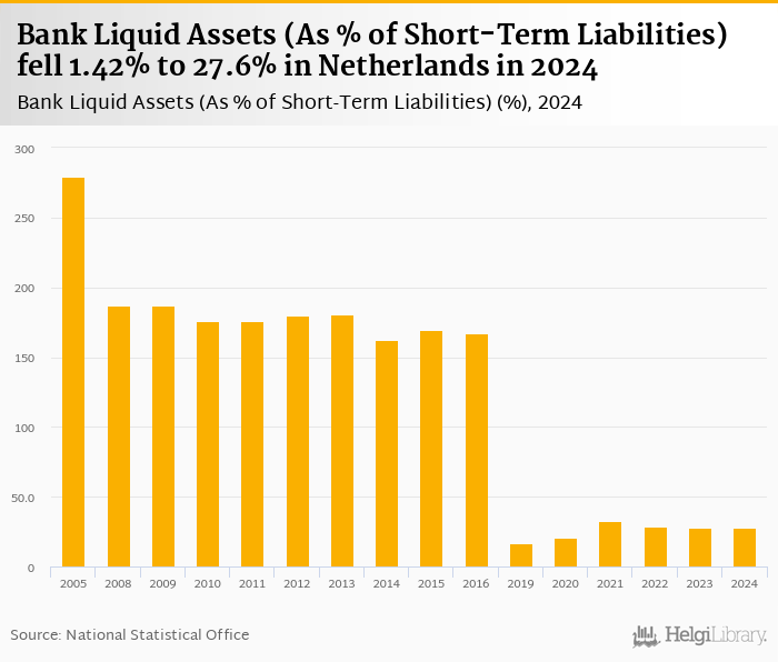 Bank liquid assets as a share of short-term liabilities fell 1.42% to 27.6% in Netherlands in 2024, according to the National Central Bank.