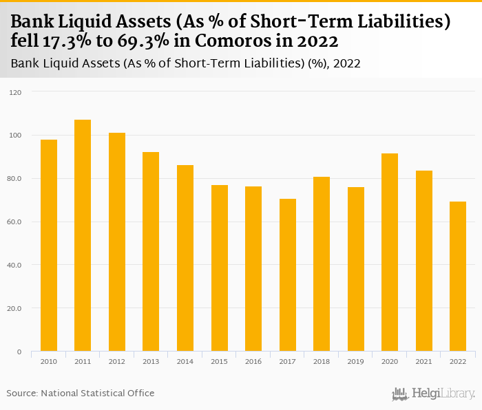 Bank liquid assets as a share of short-term liabilities fell 17.3% to 69.3% in Comoros in 2022, according to the National Central Bank.