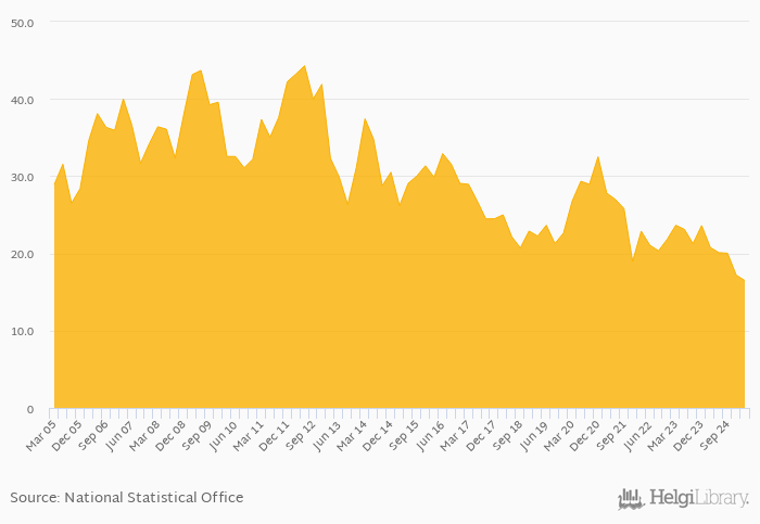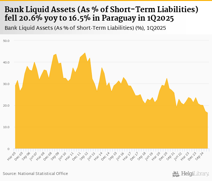 Bank liquid assets as a share of short-term liabilities fell 20.6% yoy to 16.5% in Paraguay in 1Q2025, according to the National Central Bank. This is 4.12% less than in the previous quarter.