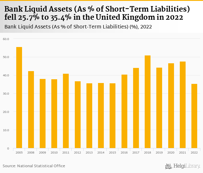 Bank liquid assets as a share of short-term liabilities fell 25.7% to 35.4% in the United Kingdom in 2022, according to the National Central Bank.