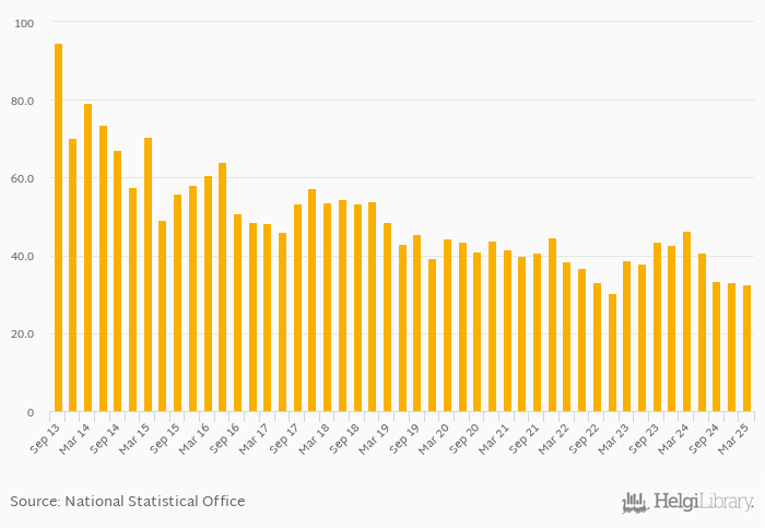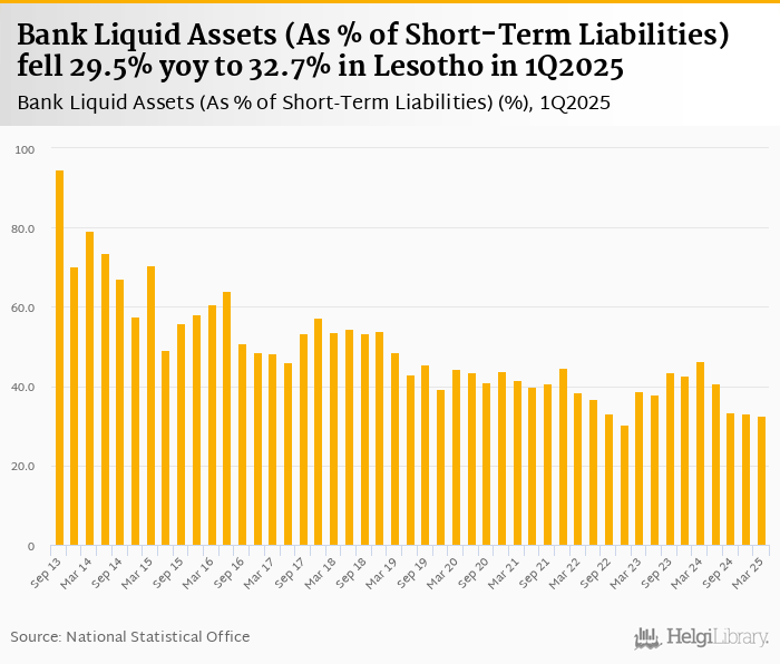 Bank liquid assets as a share of short-term liabilities fell 29.5% yoy to 32.7% in Lesotho in 1Q2025, according to the National Central Bank. This is 1.07% less than in the previous quarter.