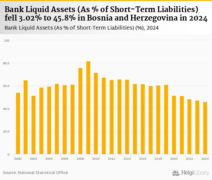Bank liquid assets as a share of short-term liabilities fell 3.02% to 45.8% in Bosnia and Herzegovina in 2024, according to the National Central Bank.