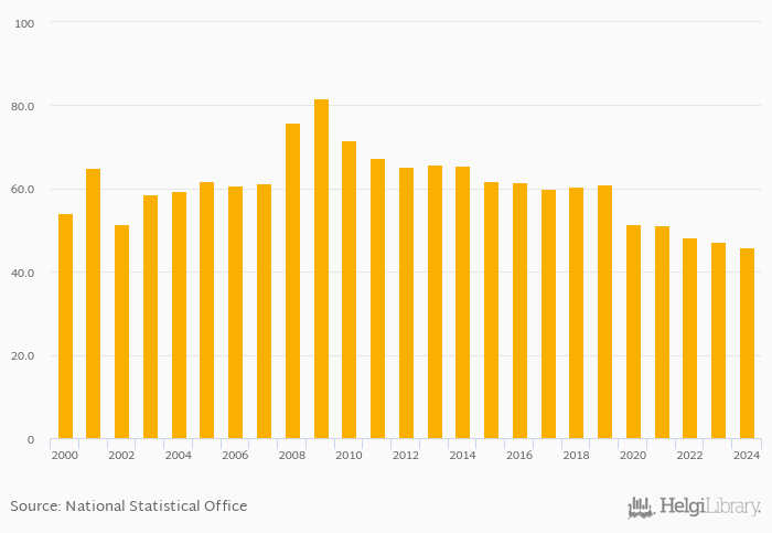 Bank liquid assets as a share of short-term liabilities fell 3.02% to 45.8% in Bosnia and Herzegovina in 2024, according to the National Central Bank.