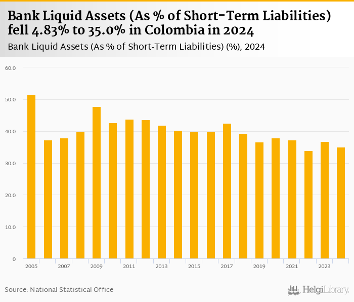 Bank liquid assets as a share of short-term liabilities fell 4.83% to 35.0% in Colombia in 2024, according to the National Central Bank.