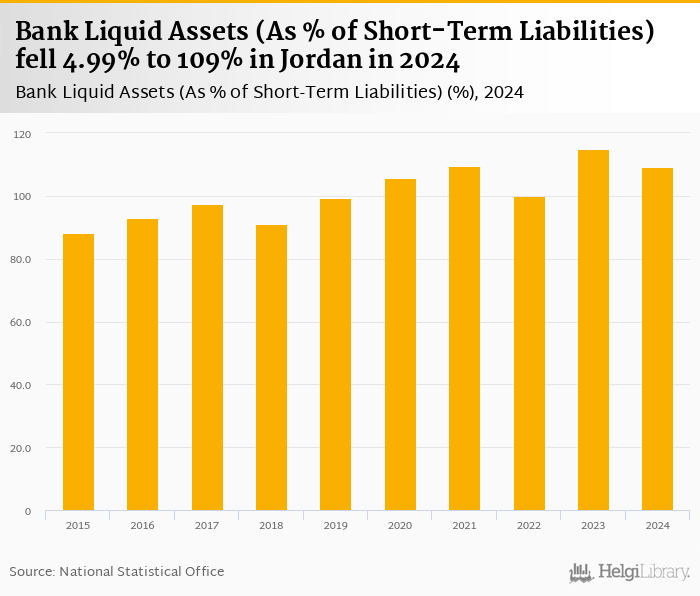 Bank liquid assets as a share of short-term liabilities fell 4.99% to 109% in Jordan in 2024, according to the National Central Bank.