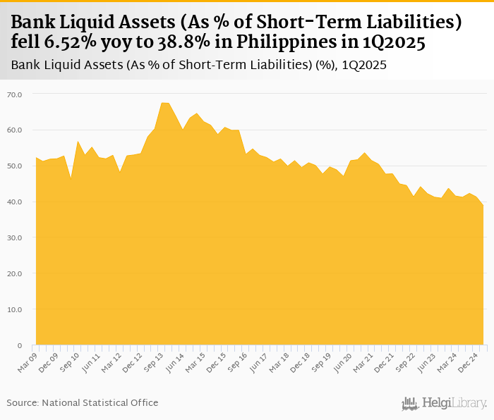 Bank liquid assets as a share of short-term liabilities fell 6.52% yoy to 38.8% in Philippines in 1Q2025, according to the National Central Bank. This is 5.89% less than in the previous quarter.