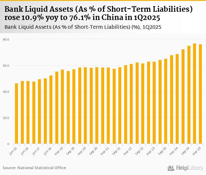 Bank liquid assets as a share of short-term liabilities rose 10.9% yoy to 76.1% in China in 1Q2025, according to the National Central Bank. This is 0.773% less than in the previous quarter.