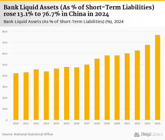 Bank liquid assets as a share of short-term liabilities rose 13.1% to 76.7% in China in 2024, according to the National Central Bank.