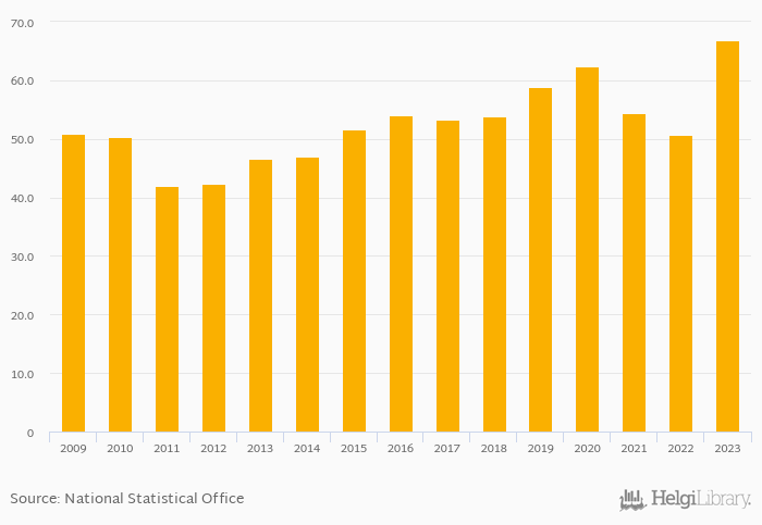 Historically, bank liquid assets as a share of short-term liabilities in Mauritius reached an all time high of 66.9% in 2023 and an all time low of 42.0% in 2011.