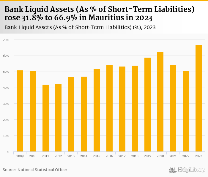 Bank liquid assets as a share of short-term liabilities rose 31.8% to 66.9% in Mauritius in 2023, according to the National Central Bank.