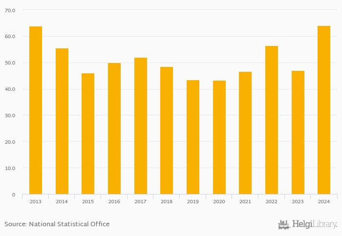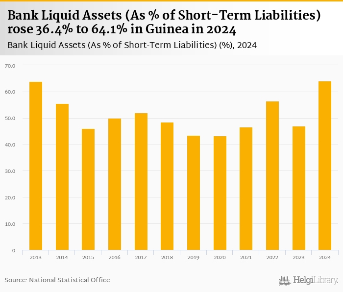 Bank liquid assets as a share of short-term liabilities rose 36.4% to 64.1% in Guinea in 2024, according to the National Central Bank.