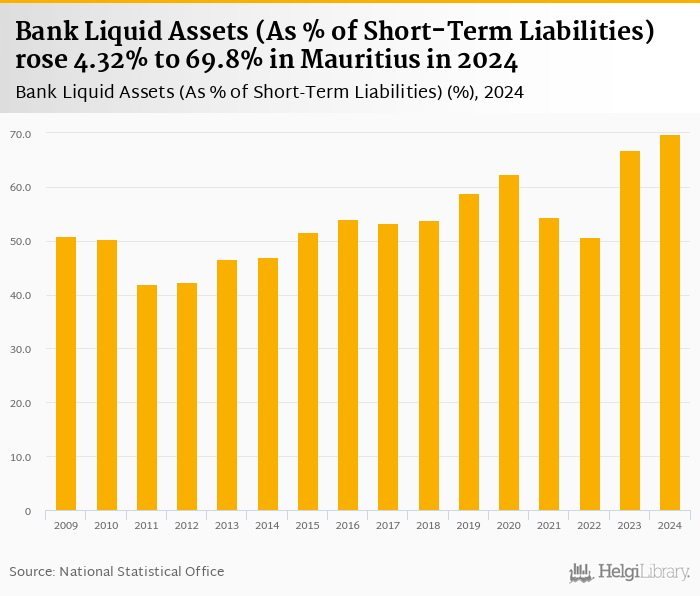 Bank liquid assets as a share of short-term liabilities rose 4.32% to 69.8% in Mauritius in 2024, according to the National Central Bank.