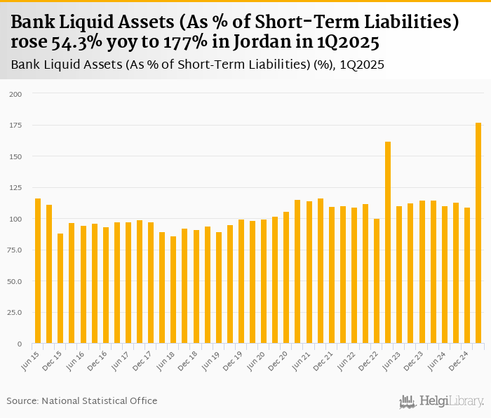 Bank liquid assets as a share of short-term liabilities rose 54.3% yoy to 177% in Jordan in 1Q2025, according to the National Central Bank. This is 62.4% more than in the previous quarter.