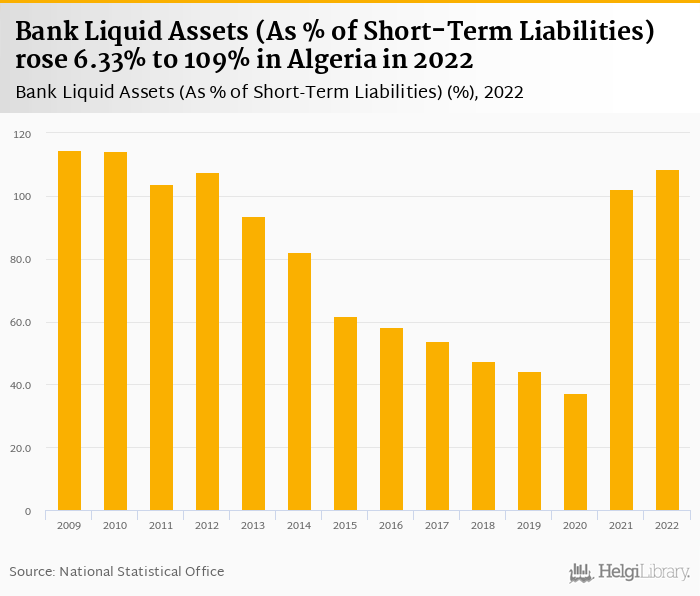 Bank liquid assets as a share of short-term liabilities rose 6.33% to 109% in Algeria in 2022, according to the National Central Bank.