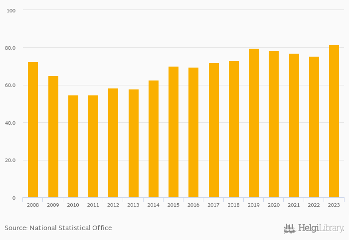 Historically, bank liquid assets as a share of short-term liabilities in Uruguay reached an all time high of 81.4% in 2023 and an all time low of 54.6% in 2011.