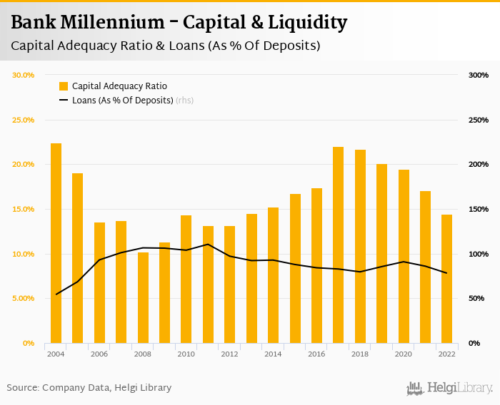 Bank Millennium's capital adequacy ratio reached 14.4% at the end of 2022, down from 17.1% compared to the previous year. Historically, the bank’s capital ratio hit an all time high of 22.4% in 2004 and an all time low of 10.2% in 2008.