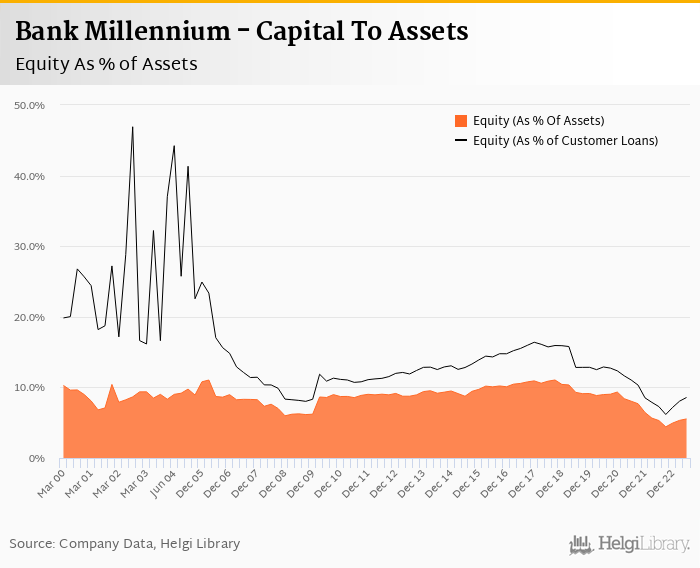 Bank Millennium's Equity reached 5.54% of total assets in the 2Q2023, up from 5.31% for the previous year. As a share of net customer loans, the ratio amounted to 8.57% at the end of the second quarter of 2023.