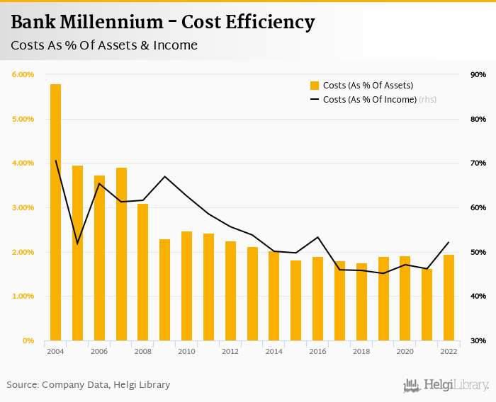 Comparing Bank Millennium with its closest peers, PKO BP operated in 2022 with a cost to income ratio of 45.1% in 2022, Pekao reached 54.5% and ING Bank Slaski some 55.7%.