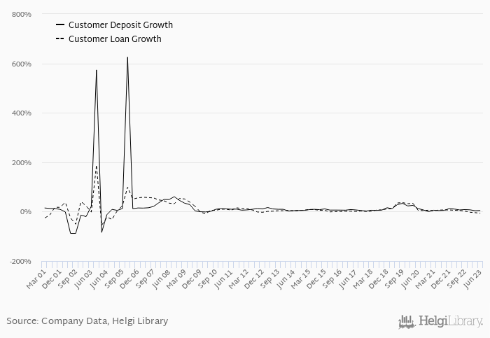 On the other hand, bank's customer deposit growth amounted to 4.66% at the end of 2023-06-30, down from 6.80% when compared to the previous year. Historically, the bank’s deposit growth reached an all time high of 626% in 2005-12-31 and an all time low of -88.2% in 2002-06-30. In the last decade, the average annual loan growth amounted to 8.57%.