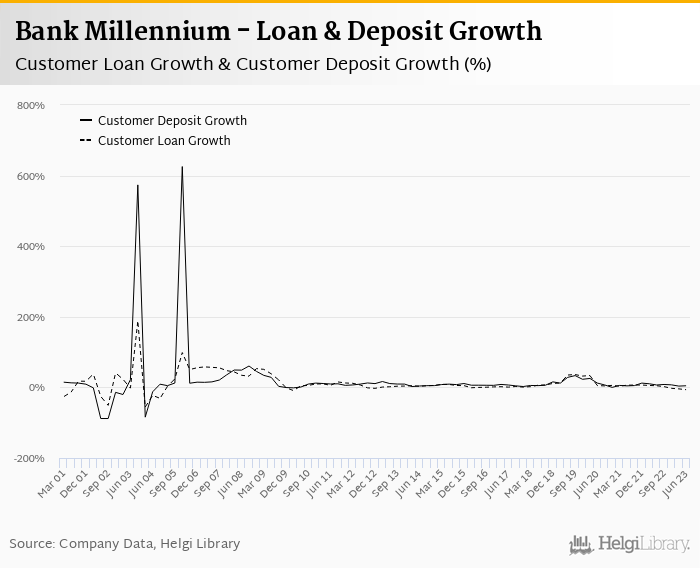 Bank Millennium's customer loan growth reached -6.54% in 2023-06-30, down from 4.68% compared to the previous year. Historically, the bank’s loans growth reached an all time high of 188% in 2003-09-30 and an all time low of -55.6% in 2003-12-31. In the last decade, the average annual loan growth amounted to 5.85%.