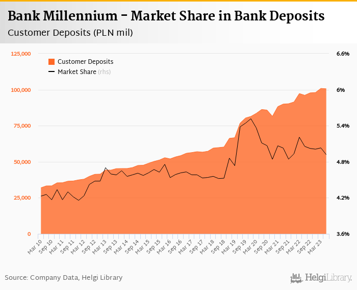 Bank Millennium accounted for 4.92% of all customer deposits taken by banks in Poland at the end of 2023-06-30. Historically, the bank’s market share in customer deposits reached an all time high of 5.52% in 2019-12-31 and an all time low of 4.16% in 2011-12-31.