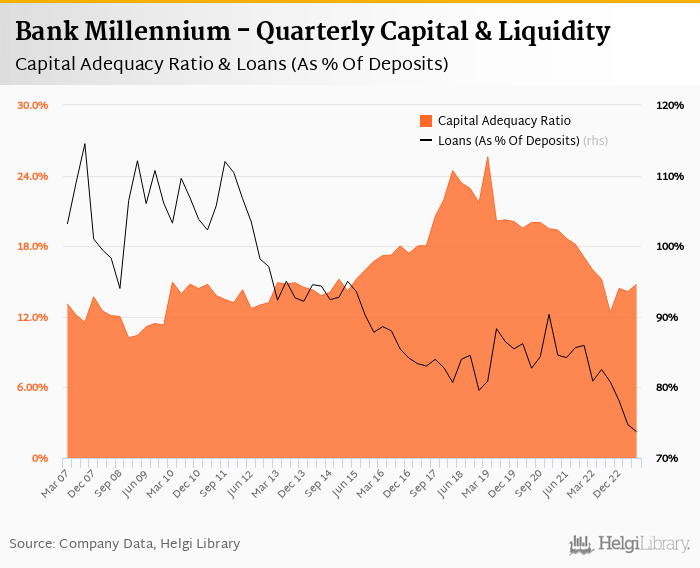 Bank Millennium's capital adequacy ratio reached 14.8% at the end of second quarter of 2023, up from 14.1% when compared to the previous quarter. Historically, the bank’s capital ratio hit an all time high of 25.6% in 1Q2019 and an all time low of 10.2% in 4Q2008.