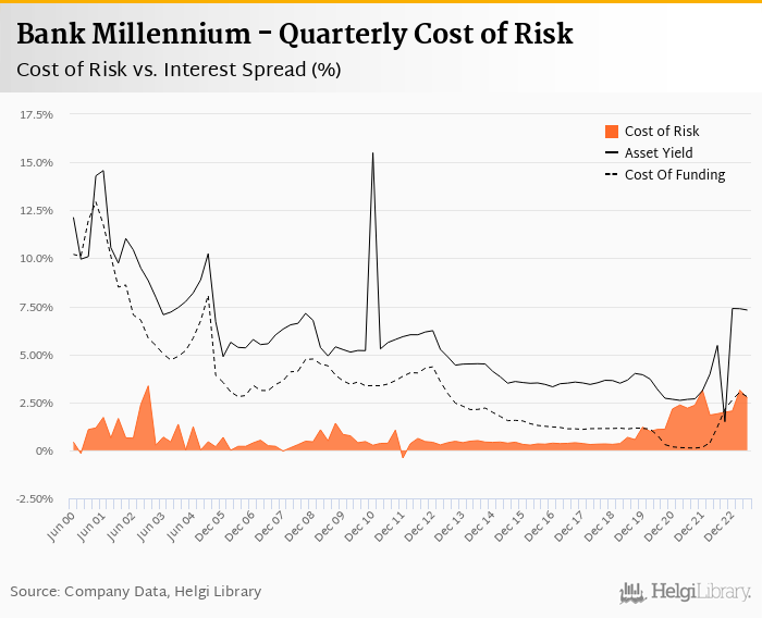 Bank Millennium's Cost of Risk (loan loss provisions as % of total assets) amounted to 2.73% in the second quarter of 2023, down from 3.14% when compared to the previous quarter.