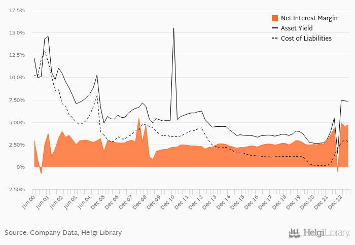 Historically, the bank’s net interest margin reached an all time high of 5.41% in 2Q2008 and an all time low of -0.773% in 4Q2000. The average margin in the last six quarters amounted to 3.57%.